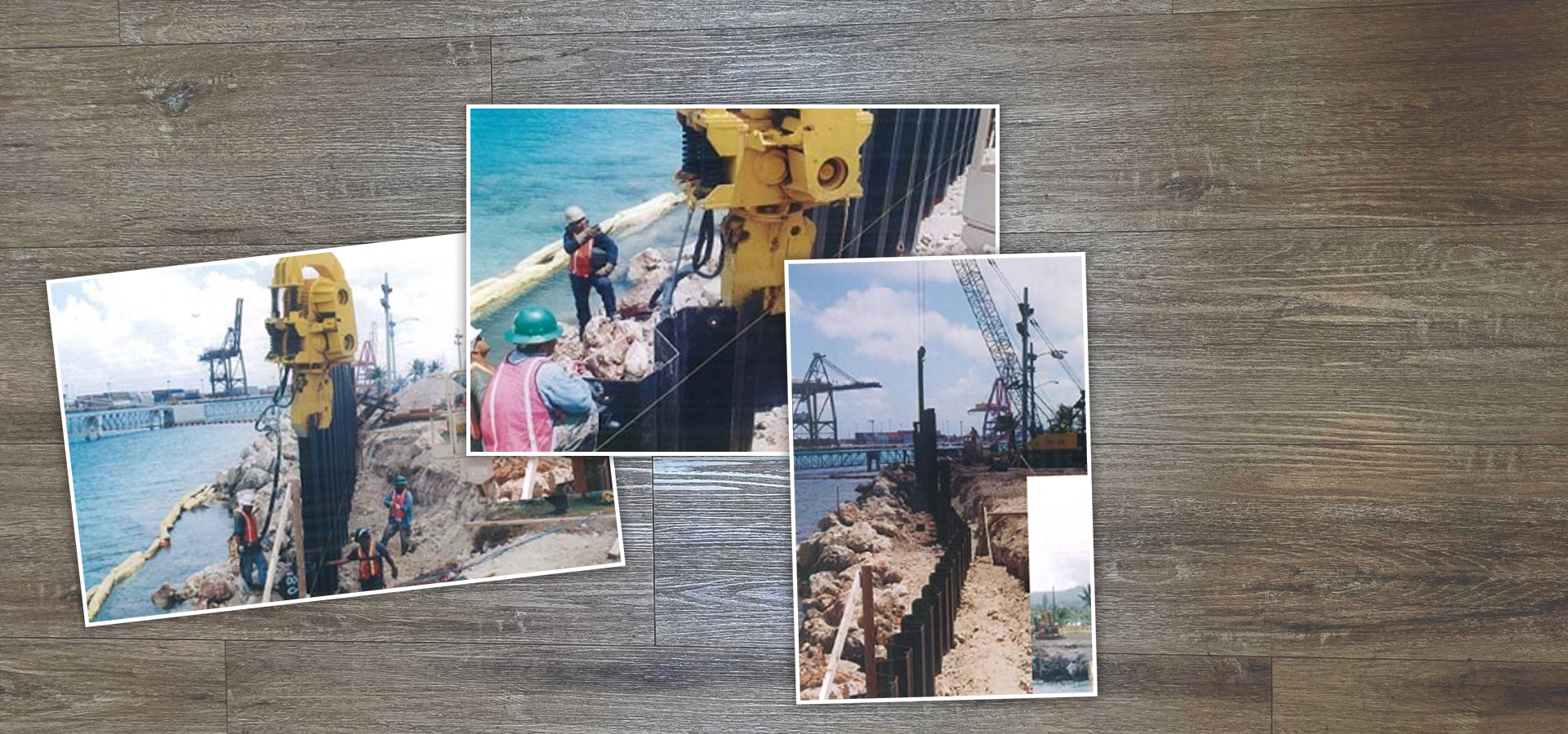 Sheet pile retaining wall, pile cap and rock revetment wall for the United States Navy.
